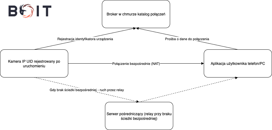 Technologia P2P upraszcza zestawianie zdalnego podglądu. Typowo kamera po uruchomieniu rejestruje identyfikator w katalogu urządzeń (chmura producenta). Aplikacja kliencka uzyskuje dane i podejmuje próbę połączenia bezpośredniego, wykorzystując automatyczne „przebijanie NAT”. W przypadku braku ścieżki bezpośredniej ruch jest przenoszony przez serwer pośredniczący (relay).