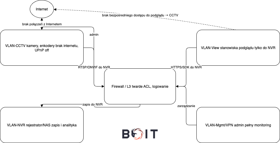 BOIT realizuje audyty sieci CCTV, projektuje segmentację VLAN i reguły L3, wdraża VPN/ZTNA i warstwę zarządzającą – management, wdrażamy rekomendacje bezpieczeństwa (wyłączone P2P/UPnP, silne hasła, MFA, szyfrowanie), integracje logów z SIEM oraz przygotowuje runbooki i procedury. Dostępna jest migracja istniejących instalacji bez przestojów.